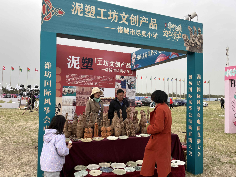 在潍坊特色非遗文创产品展区,来自诸城尽美小学的泥塑工坊文创产品吸引不少路人驻足。参加展陈的段夕臻老师告诉记者:“这次受邀参加第四十届潍坊国际风筝会,文创产品受到了广大民众的喜欢,非常感谢风筝会这个大平台,让非遗文创产品走上更大的舞台。”