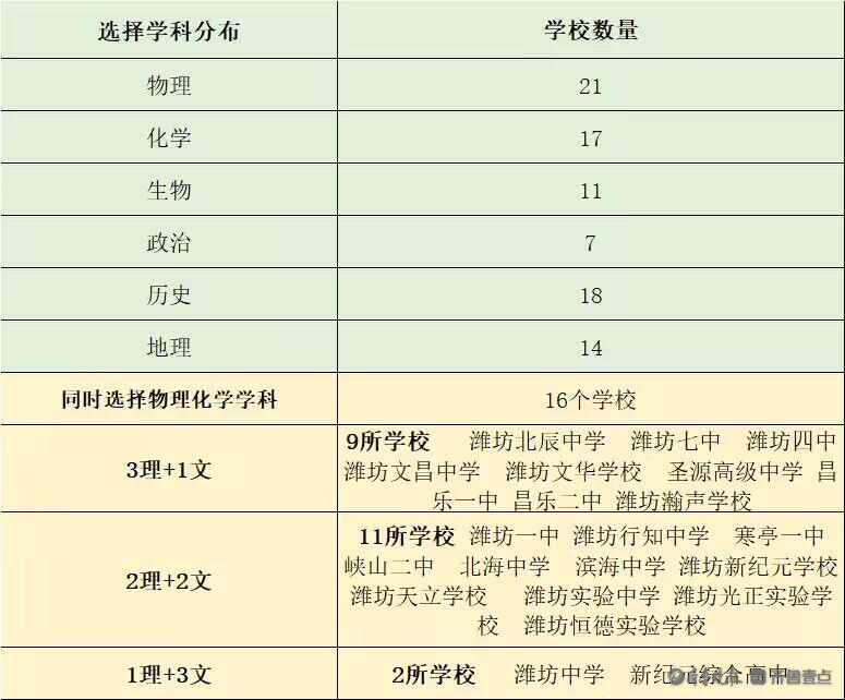 记者梳理了城区22所普通高中、综合高中,共有21所学校第二组合必选项是物理,仅有潍坊新纪元综合高中没有选择这一学科。有16所学校同时选择了物理+化学两个学科的组合,历史学科成为除物理之外,学校第二组合中最多的一个学科。