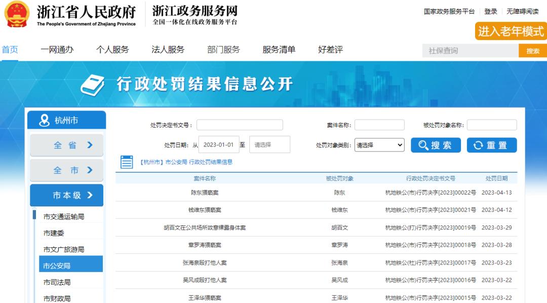 杭州市政府网公开一批公安机关实施行政处罚的情况。图/杭州市政府网截图