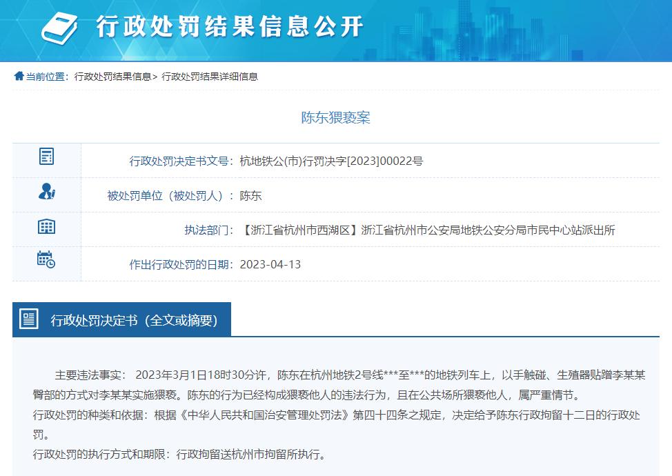 如最新一则行政处罚决定书显示:2023年3月1日18时30分许,陈某在杭州地铁2号线的地铁列车上,以手触碰、生殖器贴蹭李某某臀部的方式对李某某实施猥亵。根据《中华人民共和国治安管理处罚法》第四十四条之规定,决定给予陈某行政拘留十二日的行政处罚。
