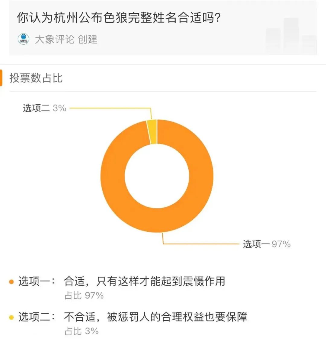 一项关于“你认为杭州公布色狼完整姓名合适吗”的问题吸引了56万人参与投票。97%的投票者选择了“合适,只有这样才能起到震慑作用”,3%的人选择了“不合适,被惩罚人的合理权益也要保障”。