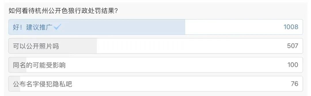 另有媒体在微博上发布“如何看待杭州公开色狼行政处罚结果”的投票,引发网友纷纷投票,大多数人认为“建议推广”,但也有少部分人担心这样的做法可能侵犯隐私、“误伤”无辜的同名群众。