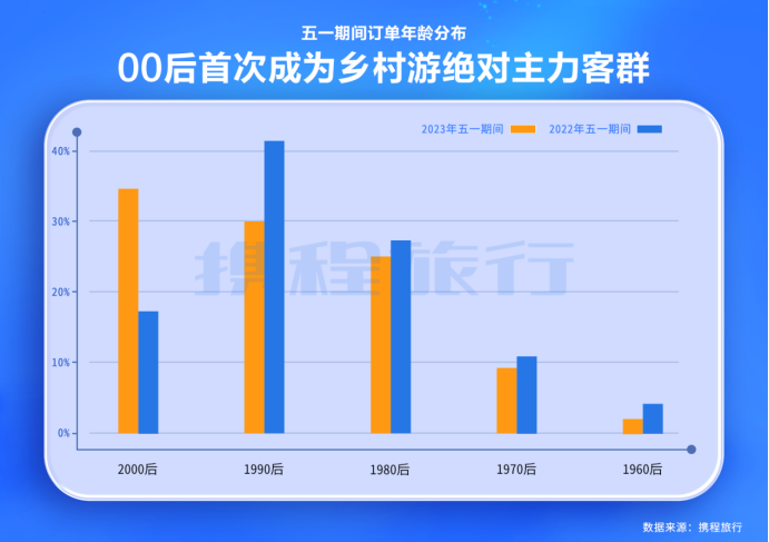 携程研究院乡村振兴研究中心公布了2023年五一期间的乡村游数据概况,从整体数据来看,五一期间,乡村游的整体订单规模已经恢复到2019年五一同期的137%,上海、北京、广州、成都、杭州成为乡村游用户最热门来源地,并且在乡村停留3天以上的订单占比相较于2019年也提升了123%。最值得关注的是,今年五一乡村游订单中,00后人数占比超过34%,领先于90后和80后,第一次成为了乡村旅游的绝对主力。
