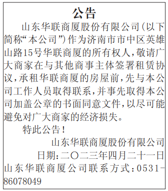 山东华联商厦股份有限公司公告 大众报业·齐鲁壹点 2023-04-27 2296 山东华联商厦股份有限公司(以下简称“本公司”)作为济南市中区英雄山路15号华联商厦的所有权人,敬请广大商家在与其他商事主体签署租赁协议,承租华联商厦的房屋前,先与本公司工作人员取得联系,并事先取得本公司加盖公章的书面同意文件,以尽可能避免对广大商家的经济损失。 特此公告! 山东华联商厦股份有限公司 2023年4月21日 山东华联商厦公司联系方式:0531-86078049 责任编辑:宋欢