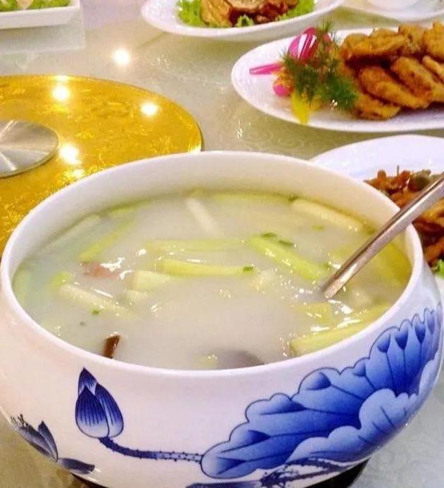 奶汤蒲菜:济南大明湖出产的一种质地鲜嫩、味道清鲜的蒲菜为主料,加奶汤烹制而成,素有"济南汤菜之冠"的美誉,又历来被人们誉为济南第一汤菜。