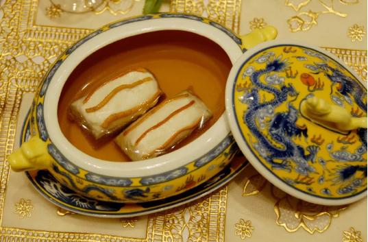 这是看着特别清爽的一道美食,盛在盘子里活像个趴着的整鸡,鸡脱骨后,肚里塞满海参、大虾、鸡丁、笋丁、香菇等,味道非常鲜美,这种塞满料的鸡肉,连同鸡汤都更鲜美,简直赞不绝口!
