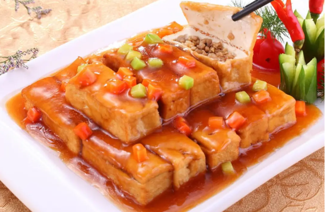 豆腐箱:豆腐箱是淄博的一道传统名菜,它主要是用油炸好的豆腐块,在豆腐块中填充馅料,然后入锅蒸制而成,现在你可以吃到的豆腐箱已经由原来的传统素馅料、三鲜馅料转变为了虾仁馅料、海肠韭菜、黑椒牛肉等12种馅料。