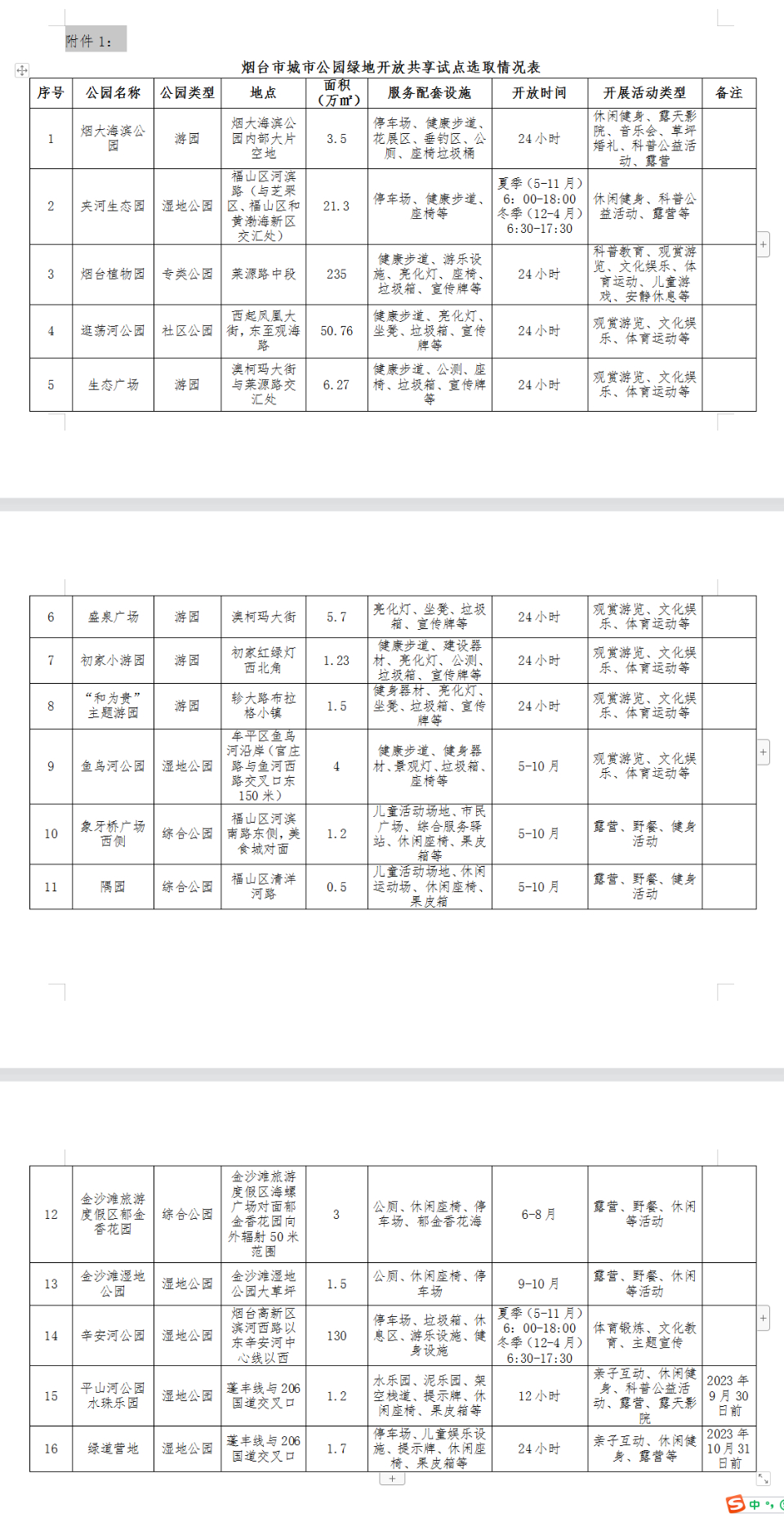 附:16处公园绿地名单