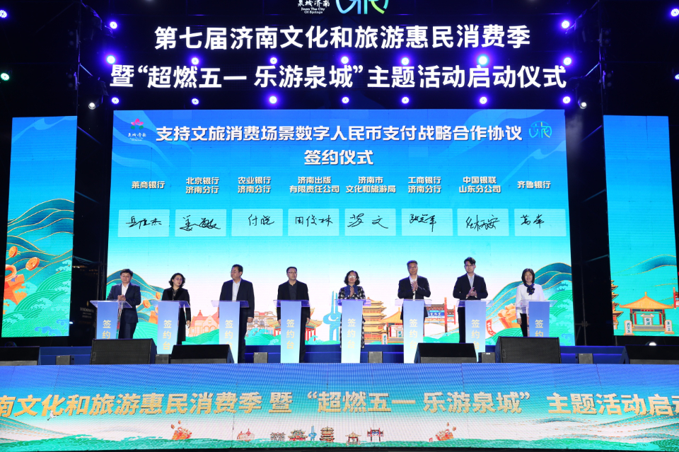 其中,打造文旅消费矩阵和支持数字人民币消费场景是本届消费季的两大亮点。启动仪式现场,济南市文化和旅游局与济南出版有限责任公司联合中国银联山东分公司、工商银行山东省分行、农业银行山东省分行、齐鲁银行、莱商银行、北京银行济南分行6家金融机构签订支持文旅消费场景数字人民币支付战略合作协议,共同推动数字人民币在文旅领域的应用推广。