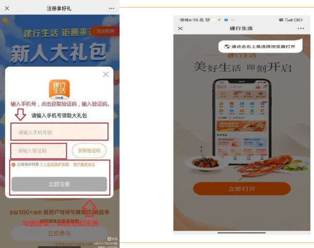 (1)点击【立即参与】定位城市烟台,输入手机号—获取验证码—立即注册,点击右上角选择浏览器打开下载进入建行生活
