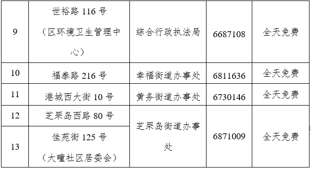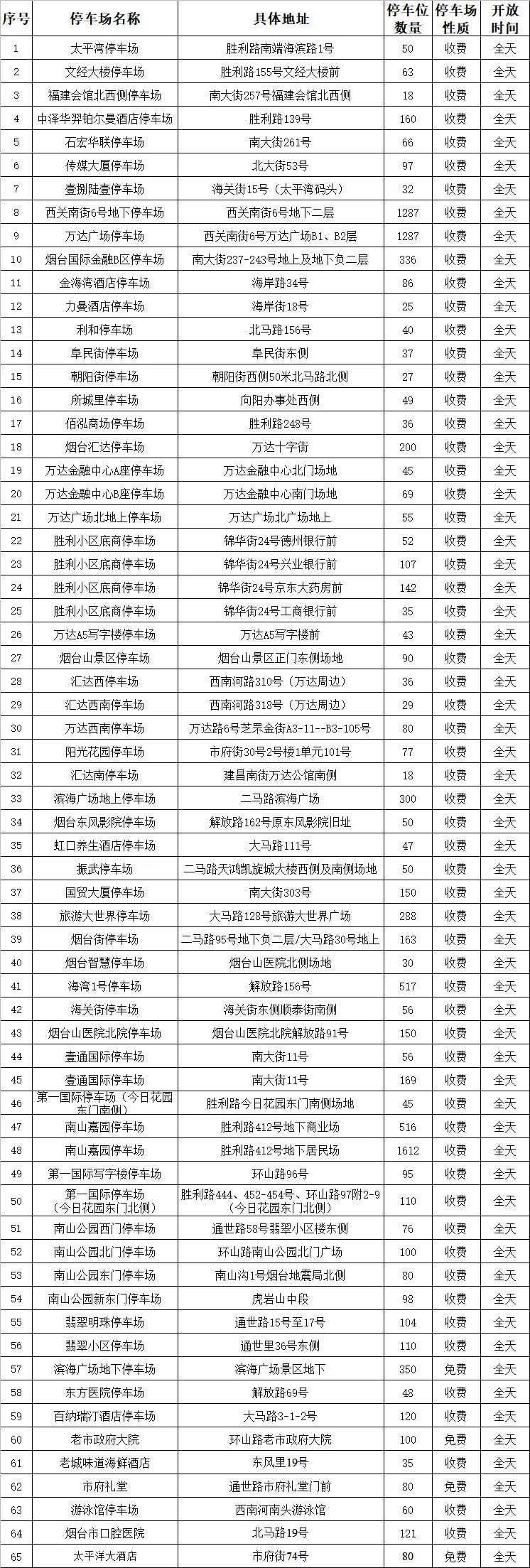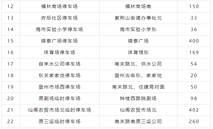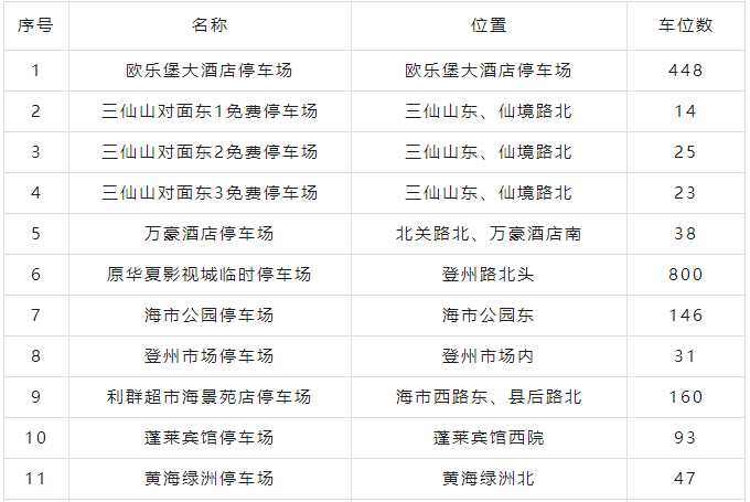 蓬莱区委、区政府还协调了22个免费停车场3497个车位,具体如下: