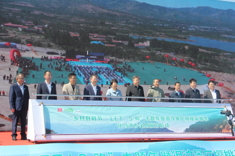 活动现场,伴随推杆卷轴缓缓展开,王爱新、郭德文、冯能斌、戴军、吕升轩、李洪洲、张培峰、贾夫军、王玉坚、时贞强共同为“乡村好时节· LET'S 购”主题年暨徂汶景区樱桃采摘季·化马湾乡全域旅游”活动启幕。