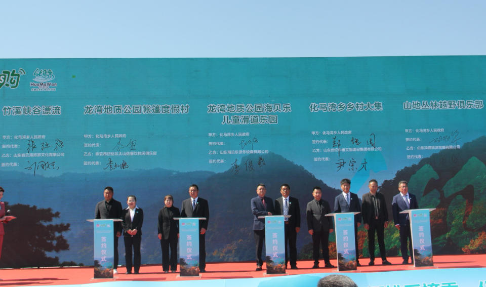 随后,有关部门分别与竹溪峡谷漂流、龙湾地质公园帐篷度假村、龙湾地质公园海贝乐儿童滑道乐园、乡村大集、山地丛林越野俱乐部、泰山职业技术学院战略合作、山东财经大学文化和旅游产业学院社会实践基地、济泰自驾天路线路开发、新闻宣传战略合作、化马湾全域旅游市场开拓合作等项目及运营团队进行了现场签约。
