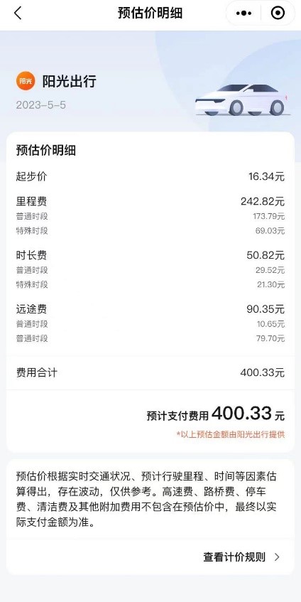 至于网约车,澎湃新闻了解到,打车平台的计费标准中,总计价就已包括了“远程费”。澎湃新闻分别在高德打车、滴滴出行和哈啰出行预订从“上海-苏州”同一起点、终点的网约车,发现不同网约车的预估价明细中,除了里程费和时长费之外,均有一项名为“远途费”的费用。
