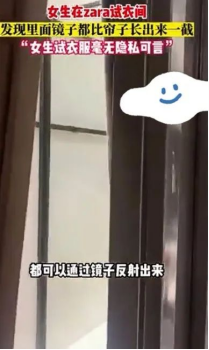 5月7日,在北京西单大悦城zara一层的试衣间中,有女生发现所有单人镜都比帘子长出一段,并且帘子没有挂钩,外部可以通过长镜反射看到试衣间中的一切,这给女性顾客的试衣隐私带来了极大的风险。