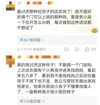 也有网友表示,这种试衣间的最大问题还不是镜子比帘子宽,而是没有挂钩,导致自己在试衣服的时候,外面的人经常问都不问一声就直接拉开帘子,还经常有“熊孩子”随便拉帘子,“上次在一家店试裙子,都脱得只剩内衣内裤了,突然帘子被一个小孩拉开了,还好手里有衣服挡了一下,外面直接是衣服展示区,当时就想骂人了。