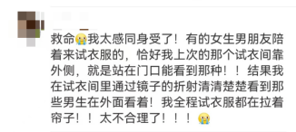 视频一经曝光,不少对此感同身受的网友纷纷分享了自己在试衣时遇到的类似尴尬经历,“我亲身体验过,这个设计是真的不合理……”“每次在这种试衣间试衣服都特别慌”,同时网友呼吁各个店家,不要使用“拉帘”式试衣间。