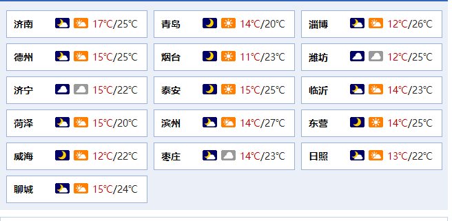 最低气温:烟台和威海11℃左右,其他地区14℃左右。