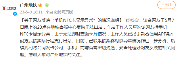 5月9日晚,广州地铁回应:经核实,该名网友于5月7日晚上约23点在地铁客服中心反映无法出站,车站工作人员查询该网友持手机NFC卡显示异常,由于无法即时查询卡片情况,工作人员已指引乘客使用APP乘车码方式按实际行程支付出站。目前,已联系该乘客对该异常情况作进一步分析。后续我司将会同发卡公司、手机厂商与乘客密切沟通,妥善处理好网友反映的相关问题。感谢大家对广州地铁的关注。