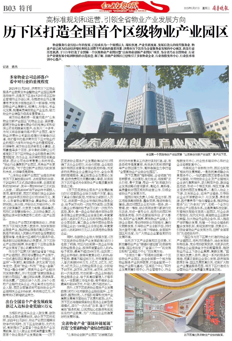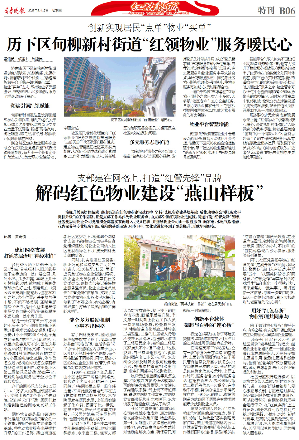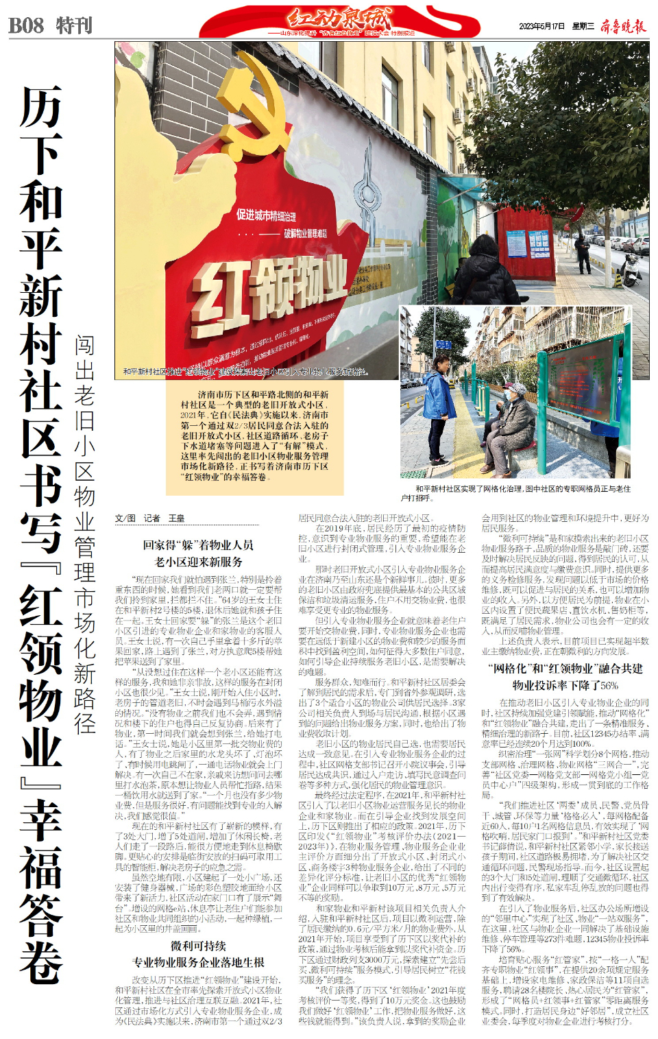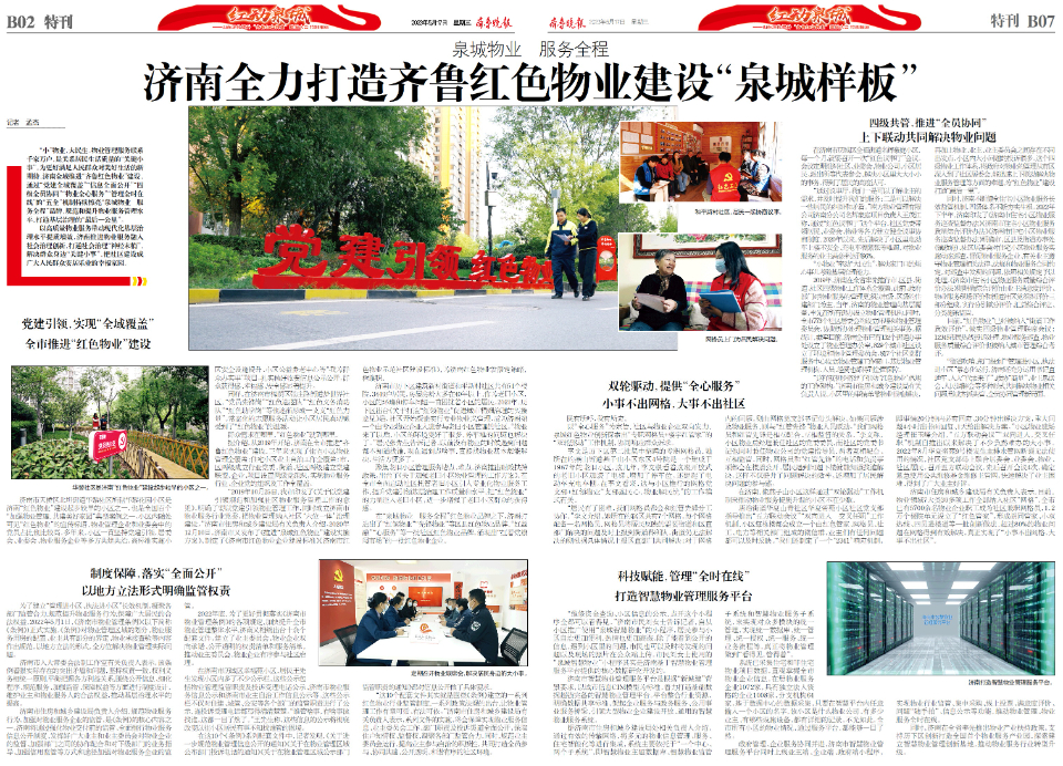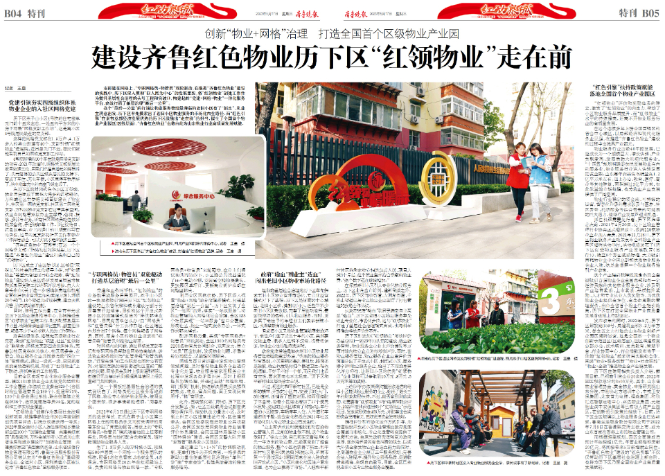 5月18日,深化提升“齐鲁红色物业”建设工作会议将在济南举行。5月17日,齐鲁晚报·齐鲁壹点策划推出8个版《红动泉城——山东深化提升“齐鲁红色物业”建设大会特别报道》,全方位报道在推进“齐鲁红色物业”建设的三年多时间中,济南市“泉城红色物业”、济南市历下区“红领物业”的经验做法。济南持续擦亮“泉城物业 服务全程”的“红色物业”品牌,更在历下区催生出走在“齐鲁红色物业”建设前列的“红领物业”。