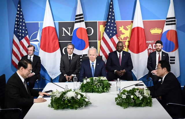 去年6月北约峰会期间,美国总统拜登与韩日两国首脑举行三方会晤。
