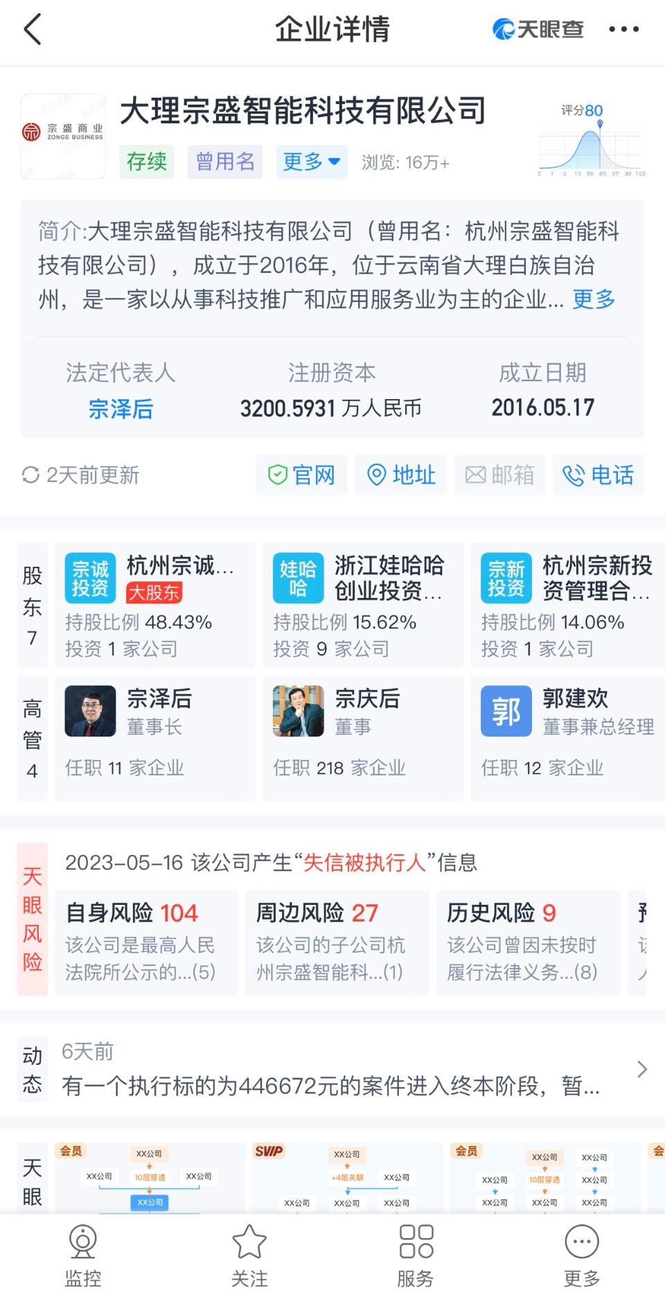股权构成方面,娃茅酒业股东由大理宗盛智能科技有限公司(简称“宗盛智能”)与杭州宗盛商业发展有限公司构成,二者持股比例七三开,实际控制人为宗泽后。