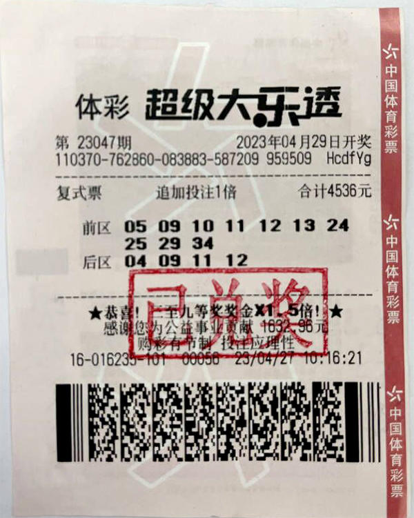 5月9日,大奖得主现身体彩中心领走了这份千万大奖。经工作人员验证确认,票面投注金额为4536元,采用前后区复式投注,前区投注10个号码,后区投注4个号码,追加投注1倍。这张彩票共中得一等奖1注、二等奖4注、三等奖1注、四等奖25注、五等奖100注、六等奖100注、七等奖25注、八等奖500注、九等奖526注,单票中奖金额为29840844元,在大乐透10亿派奖的加持下,奖金成色十足。