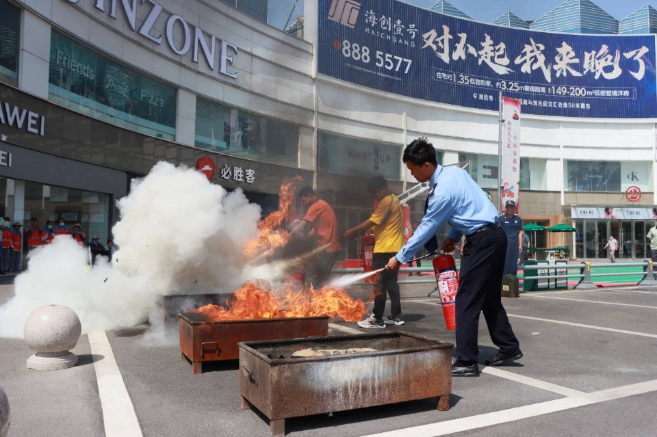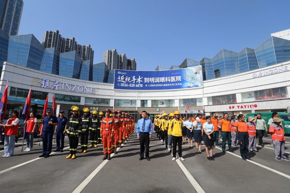 仪式最后,与会领导现场观摩了4支“潍路先锋”消防志愿服务队建设成果,“火焰蓝”联动“黄骑士”,每辆外卖车都是一个移动消防宣传站,每一名骑手化身“消防宣传员”为群众送上“安全餐”,通过消防提示餐箱贴、垫餐纸、封口贴、常识折页、外卖单等开展“流动型”消防宣传;邮政志愿服务队在走街串巷过程中,借助快递车上的消防安全标语及消防宣传元素扩大消防宣传覆盖面,将消防安全手册、常识贴纸随报刊、信件、包裹等进行投递、配送到客户手中;公交志愿服务队深入开展消防宣传进车厢活动,以市民喜闻乐见、寓教于乐的形式,在车内看板、护板等位置设置消防科普、应知应会知识等宣传阵地,充分发挥车厢文化优势,展现消防宣传效果;奎文大队与环卫消防志愿服务队展开灭火实战演练,模拟在工作过程中若发现火灾事故,可以第一时间拨打报警电话,准确表达发生火灾的地点、建筑情况等要素,做好消防车引导工作,并视情利用周边消防设施开展初期火灾扑救,真正做到会宣传、会预警、会灭火,有效提升城市抵御风险能力。与会领导共同观摩了消防器材装备展示,随后进入银座商城观摩消防宣传标准化建设。
