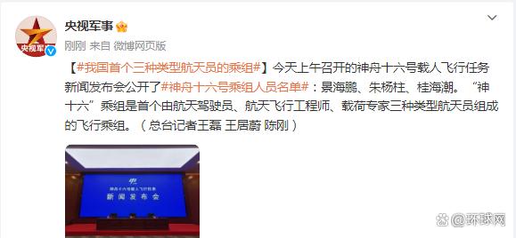 “神十六”乘组是首个三种类型航天员的乘组 央视军事 2023-05-29 1.2万 29日上午召开的神舟十六号载人飞行任务新闻发布会公开了神舟十六号乘组人员名单:景海鹏、朱杨柱、桂海潮。“神十六”乘组是首个由航天驾驶员、航天飞行工程师、载荷专家三种类型航天员组成的飞行乘组。 (央视军事) 责任编辑:彭茜