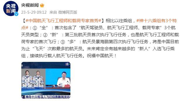 相比以往乘组,神十六乘组有3个特点:①“全”:首次包含了“航天驾驶员、航天飞行工程师、载荷专家”3个航天员类型;②“新”:第三批航天员首次执行飞行任务,也是航天飞行工程师和载荷专家的首次飞行;③“多”:航天员景海鹏第四次执行飞行任务,将是中国目前为止“飞天”次数最多的航天员。未来肯定会有越来越多的“新人”入选飞行乘组,接续执行载人航天飞行任务。祝福中国航天!