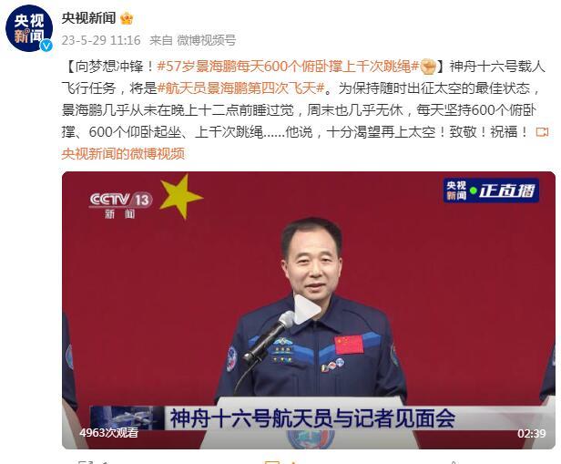 向梦想冲锋!57岁景海鹏每天坚持600个俯卧撑、上千次跳绳 央视新闻微博 2023-05-29 7.5万 神舟十六号载人飞行任务,将是航天员景海鹏第四次飞天。为保持随时出征太空的最佳状态,景海鹏几乎从未在晚上十二点前睡过觉,周末也几乎无休,每天坚持600个俯卧撑、600个仰卧起坐、上千次跳绳……他说,十分渴望再上太空!致敬!祝福! (央视新闻微博) 责任编辑:彭茜