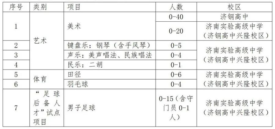(二)招生项目及人数根据我校实际,报济南市教育局批准,2023年济钢高中(含兴隆校区)共招收艺体特长生95人,分为艺术、体育和“足球后备人才”试点项目三大类,共7个专业,分校区招生,一起实施整建制级部管理,即“五统一”:统一行政业务管理,统一师资配备,统一教育教学计划,统一编排班级,统一在一个校区学习生活。具体招生专业、人数及校区如下: