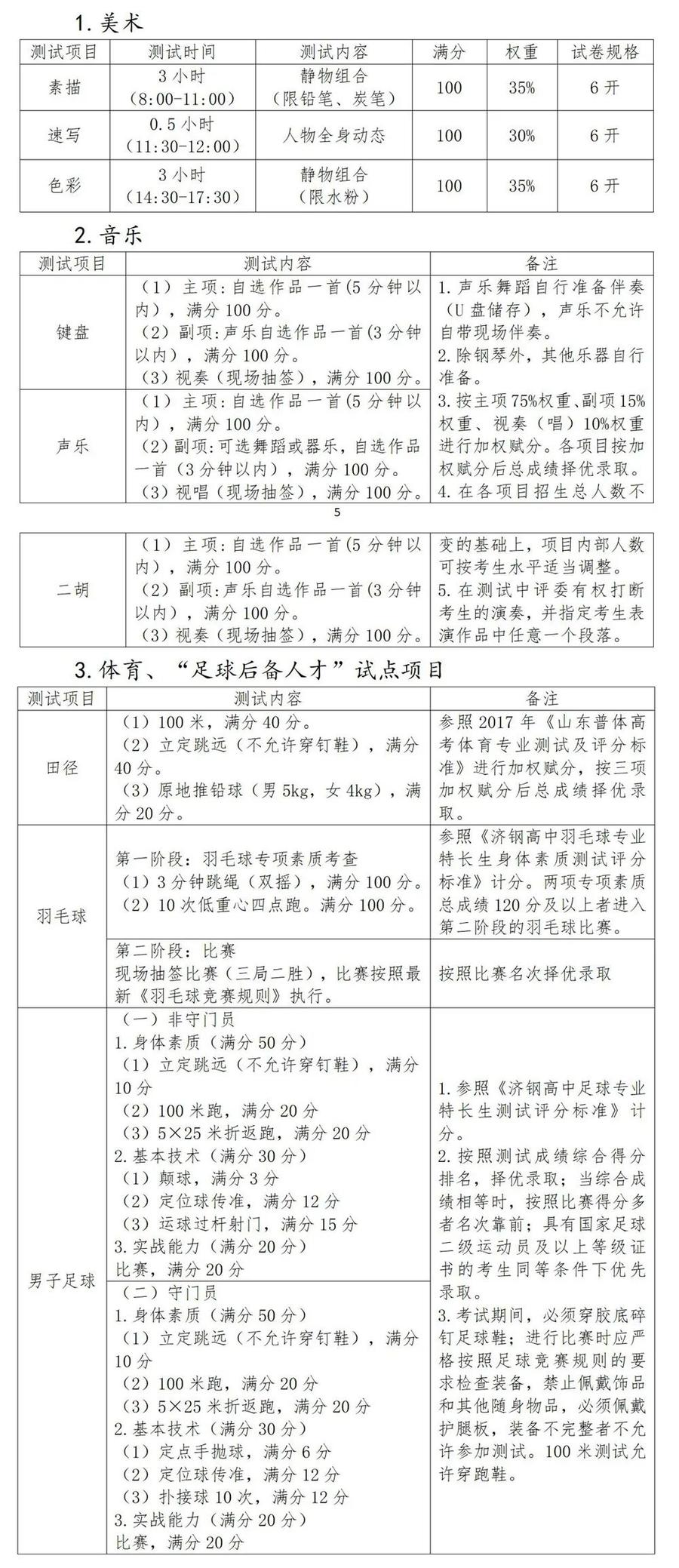 (三)根据《2023年济南市普通高中学校招收艺体特长生工作方案》要求,考生专业测试合格但未能达到我校录取分数线要求而产生的剩余特长生计划数,将纳入我校统招生计划。若招生项目出现空缺或考生达不到学校专业测试要求,我校将减少或放弃相应项目特长生招生计划数,产生的剩余特长生计划一并纳入统招生计划。