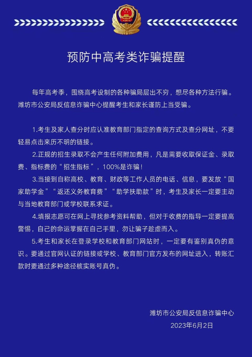 中高考来临,潍坊市公安局反信息诈骗中心发布紧急预警