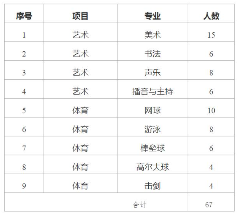 注:如因考生未能达到我校专业测试要求,或达到专业测试要求但初中学业水平考试成绩、等级科目成绩未达到我校艺体特长生录取要求而产生的剩余计划数,将纳入我校统招生计划