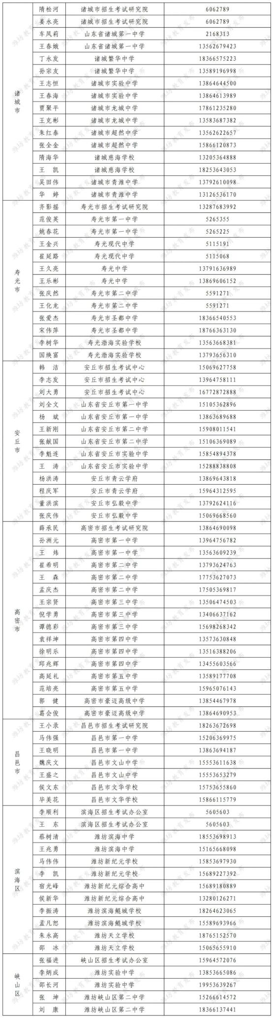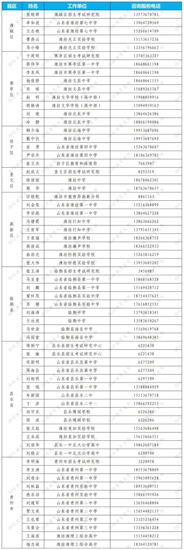 潍坊市2023年高考志愿咨询师人员名单公布 大众报业·齐鲁壹点 2023-06-06 1086 记者 王钟玉 秦国玲 为切实做好2023年高考政策宣传及志愿咨询服务工作,便于广大考生了解高考改革政策、咨询志愿填报方法,潍坊市教育局在各县市区、市属开发区招生考试机构和普通高中学校组建了潍坊市高考志愿咨询师队伍,现将有关人员名单予以公布。考生和家长如需咨询,可在工作时间联系。 潍坊市招生考试研究院咨询监督电话:8232582。 责任编辑:蔚晓贤