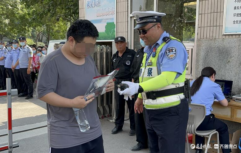 聊城三中考点,执勤交警喊话粗心考生:“考试文件袋帮你找到啦”