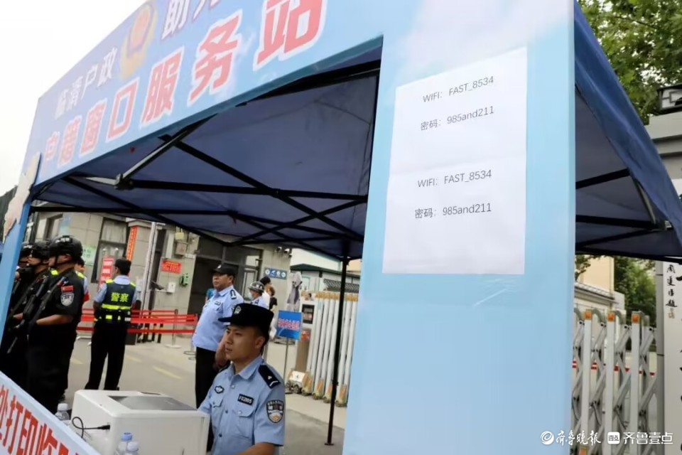 在许许多多忙碌的身影和画面中,高考服务加油站的wifi密码设置超亮眼,执勤民辅警们把它设置为“985and211”,用自己独特的方式向考生们送去祝福。