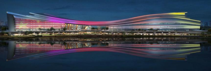 项目位于湖州市吴兴区政府南侧,主要包括体育馆、文化馆、图书馆、3D主题放映厅及配套商业。其中,中心建筑造型独特,自空中俯瞰像一条飘扬的丝带,契合丝绸文化的主题。夜景照明设计立足建筑造型,以湖州书画的气韵、笔触,丝绸的柔美、光亮为灵感,利用七彩LED灯具勾勒出建筑线条,巧妙地将建筑的轮廓美在夜幕下呈现出来。