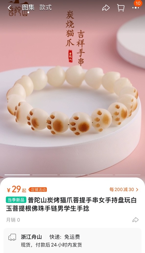 这家名为“普陀山礼物”的官方授权店,主营文创礼品。目前知道店铺的人还不多,从上架的商品看,主要以手串、手链为主。其中不乏像炭烤猫爪菩提手串这种萌系文创,乍一看很佛,再一看,还很萌,很是踩在年轻人的审美上。让网友惊呼神山也“与时俱进”了。