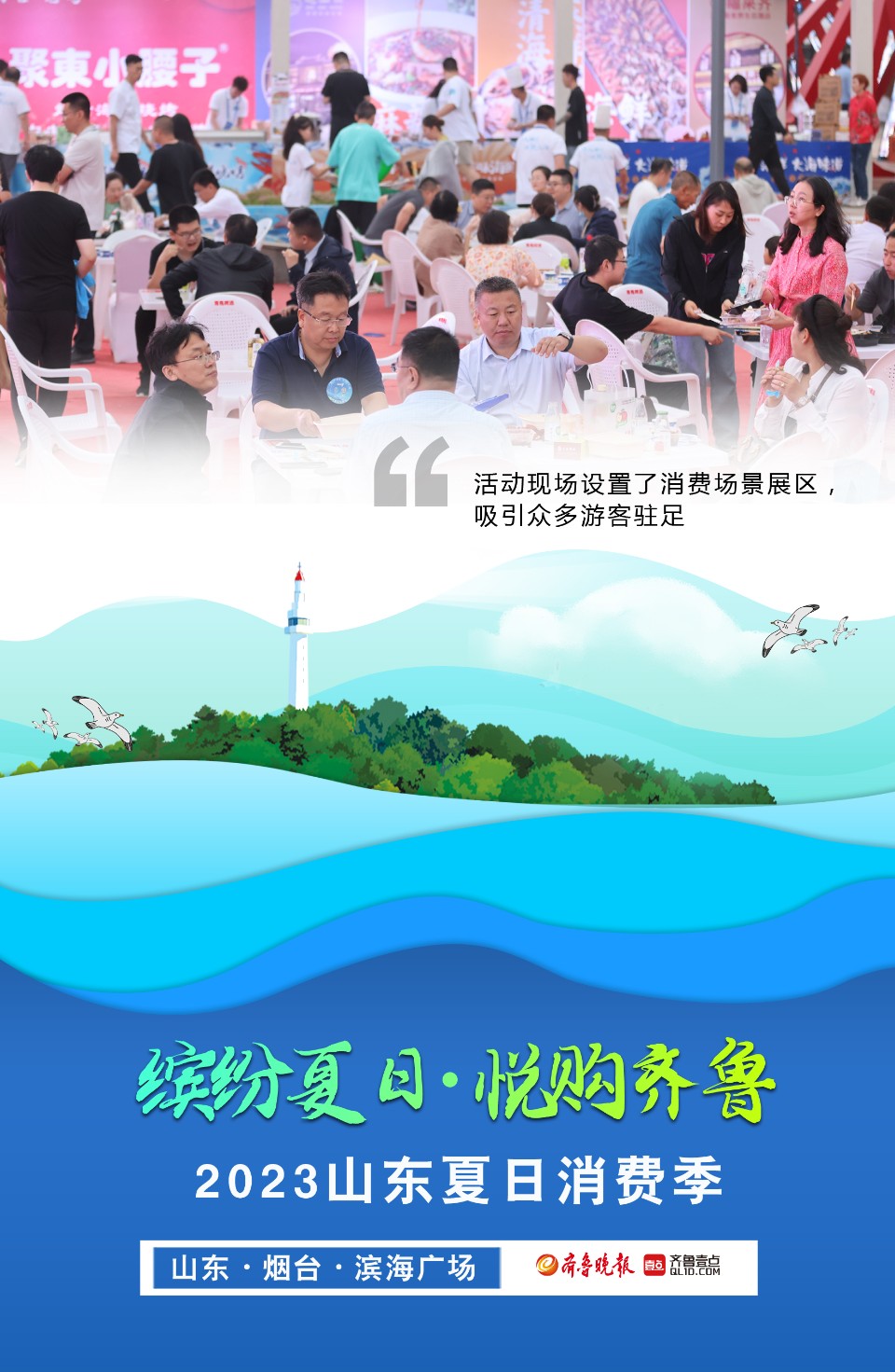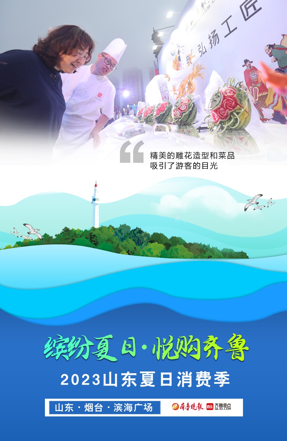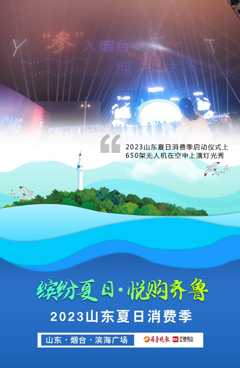 长图壹站|直击精彩瞬间!2023山东夏日消费季在烟台启动 大众报业·齐鲁壹点 2023-06-21 1165 6月20日晚,2023山东夏日消费季启动仪式在烟台举行,此次活动以“缤纷夏日·悦购齐鲁”为主题。活动现场设置了消费场景展区,烟台特色美食香气远飘,巴掌大小的鲅鱼水饺、美味的红酒、雕花造型的各种美食琳琅满目,吸引了不少游客前来品尝。650架无人机在夜空中上演灯光秀,惊艳绝伦。壹点海报为你展现精彩瞬间,带你感受现场热烈气氛。 (记者 吕奇 制图 邵舒琨) 责任编辑:武春虎