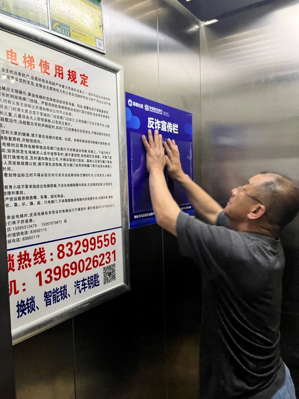 为进一步加强防范电信网络新型违法诈骗宣传教育力度,提高人民群众识骗防骗意识和网络安全防范能力,民生银行章丘支行联合双山街道海泰社区制作反诈宣传栏,并张贴布置到清华园小区每户电梯中,同时更新第一期反诈宣传内容。