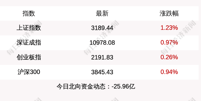 创业板指收盘上涨5.58点,涨幅为0.26%,报收2191.83点,成交额2047.14亿元;沪深300收盘上涨35.73点,涨幅为0.94%,报收3845.43点,成交额2100.98亿元。北上资金当日净流出25.96亿元。