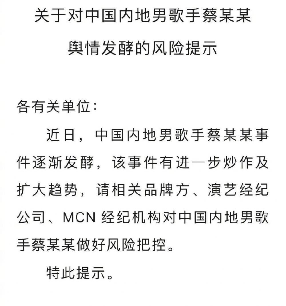 7月1日晚,北京广告协会明星代言规范委发布关于对中国内地男歌手蔡某某舆情发酵的风险提示。该提示称,近日,中国内地男歌手蔡某某事件逐渐发酵,该事件有进一步炒作及扩大趋势,请相关品牌方、演艺经纪公司、MCN 经纪机构对中国内地男歌手蔡某某做好风险把控。