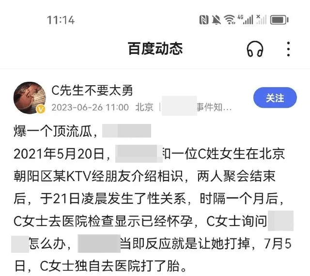 据九派新闻此前报道,6月26日,网友“C先生不要太勇”爆料称歌手蔡某某与C姓女生一夜情后致对方怀孕打胎,瞬间引爆网络。