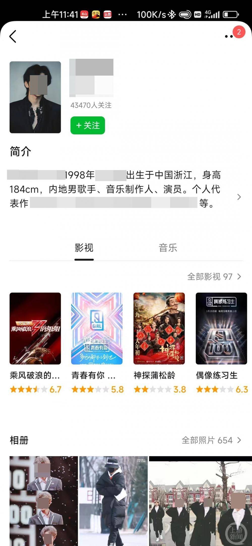 据公开资料,蔡某某拥有男歌手、演员、原创音乐制作人、MV导演等多重身份。2012年8月,蔡某某参演某偶像剧进入大众视线;2018年,参加某竞演类综艺节目并以总票数第一正式出道,成为限定男团队长。截至6月24日,据艺恩数据显示,近一个月,蔡某某排名商业价值指数榜第64名,商业价值75.39,共有28部作品,出现电影累计票房2929.03万元。