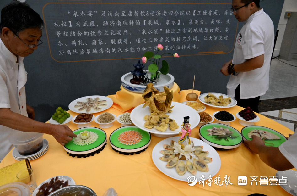 济南被誉为“泉城”,本次宴席展上,就有两桌与泉有关的宴席亮相,分别为老济南四合院带来的泉水宴与济南环联集团旗下的齐鲁名泉宴。它们多以鲁菜为底蕴,融入济南独特的“泉城、泉水”文化,在选材上偏重正宗的地域原材料,如泉水、荷花、蒲菜、脆藕等,并通过工匠鲁菜的技艺烹调,将济南的泉水魅力和工匠鲁菜的独特美味展现出来。