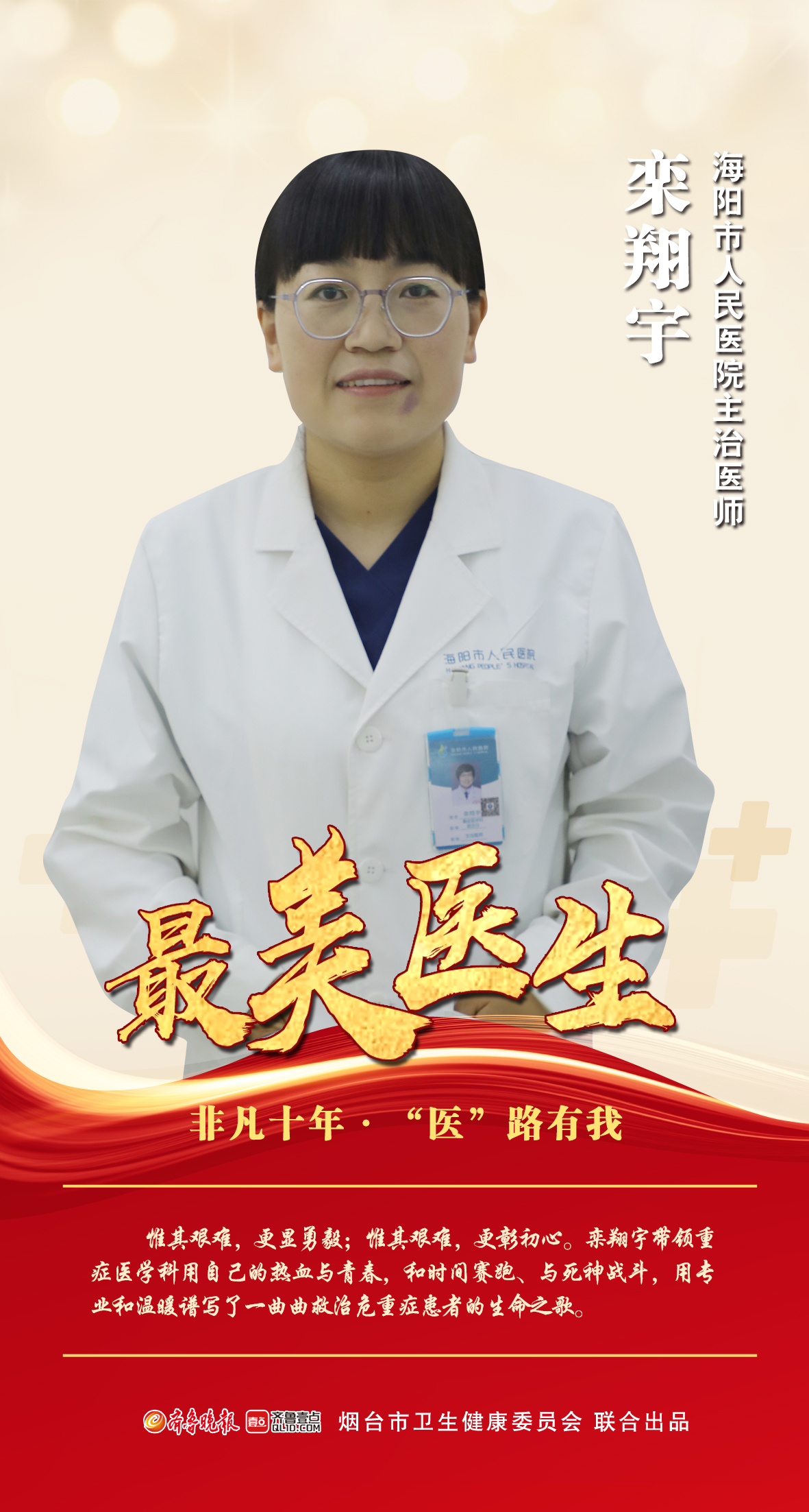 或勇于创新,以精湛的技术为生命护航;或无悔付出,始终奔忙在照护患者的最前线;或医德馨香,以满腔热忱护佑患者的就医之路。“烟台卫健这十年”涌现出了很多先进典型,为弘扬新时代卫健工作者职业精神,凝聚榜样力量,增强卫健工作者的责任感、使命感和荣誉感,即日起,齐鲁晚报·齐鲁壹点联合烟台市卫健委推出“非凡十年,‘医’路有我”系列专题报道,聚焦“医”路守护人民健康的医护人员代表,记录他们以行动践行救死扶伤的点滴瞬间。