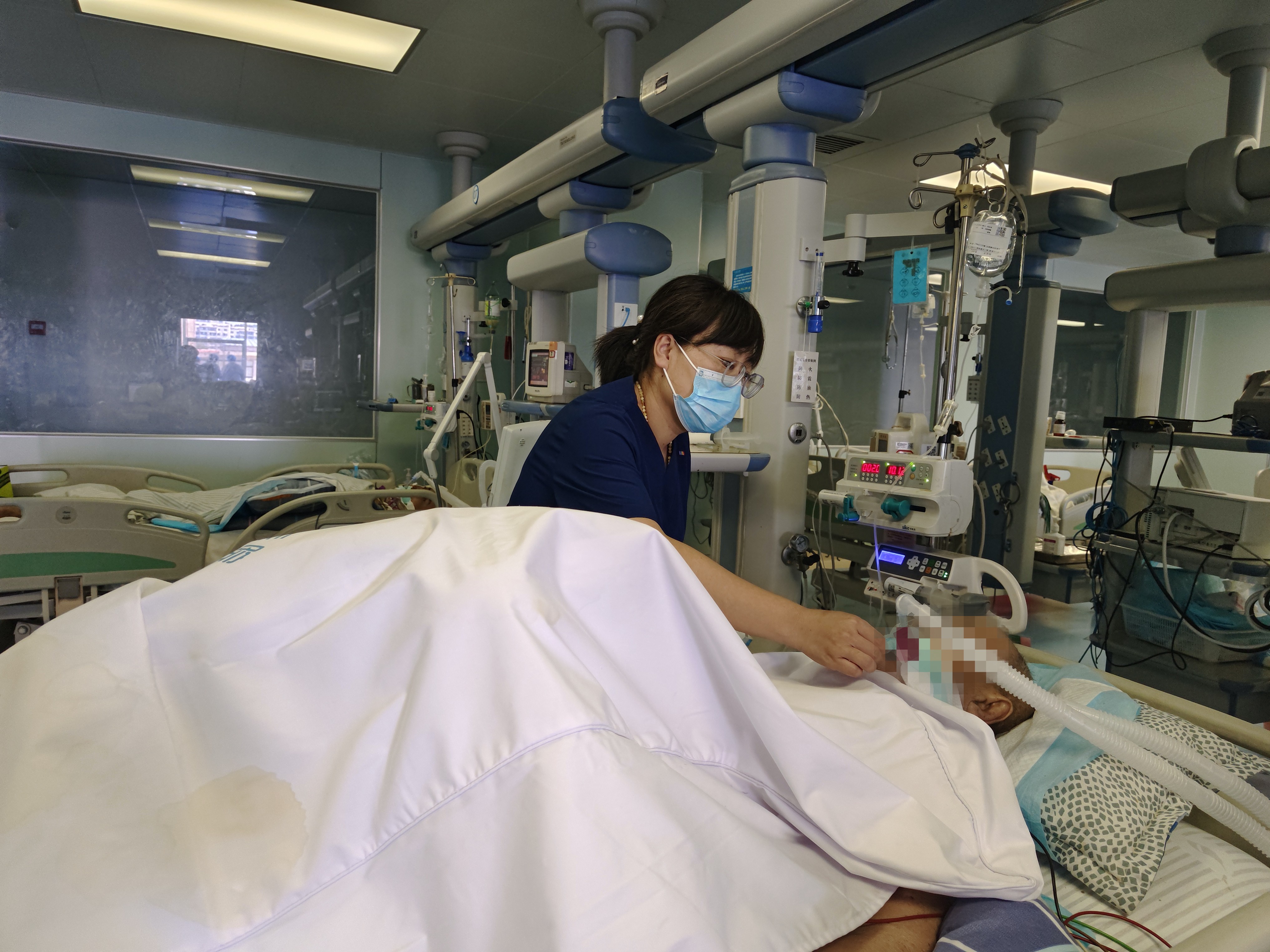 重症监护室内,多是病情危重,需要气管插管接呼吸机辅助通气的患者。一位86岁的老人因基础疾病多,病情进展快,急诊CT显示为重症肺炎,就是俗称的“白肺”。住院期间,患者出现呼吸窘迫,入院后医护人员立即给予气管插管、呼吸机辅助呼吸等紧急抢救措施,同时密切观察生命体征。栾翔宇指导医护人员对患者进行俯卧位通气,并及时与上级医院专家组进行汇报沟通,在专家的指导下,经过21天精心救治,这位老人转危为安,最终成功撤机拔管,转出重症监护室。