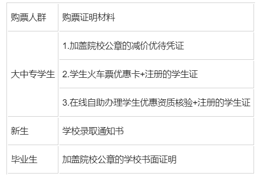 ● 大中专学生凭附有加盖院校公章的减价优待凭证、学生火车票优惠卡和经学校注册的学生证,新生凭学校录取通知书,毕业生凭学校书面证明;小学生凭学校书面证明。